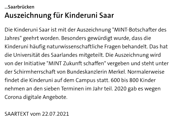 Saartext vom 22. Juli 2021: Auszeichnung für Kinderuni Saar