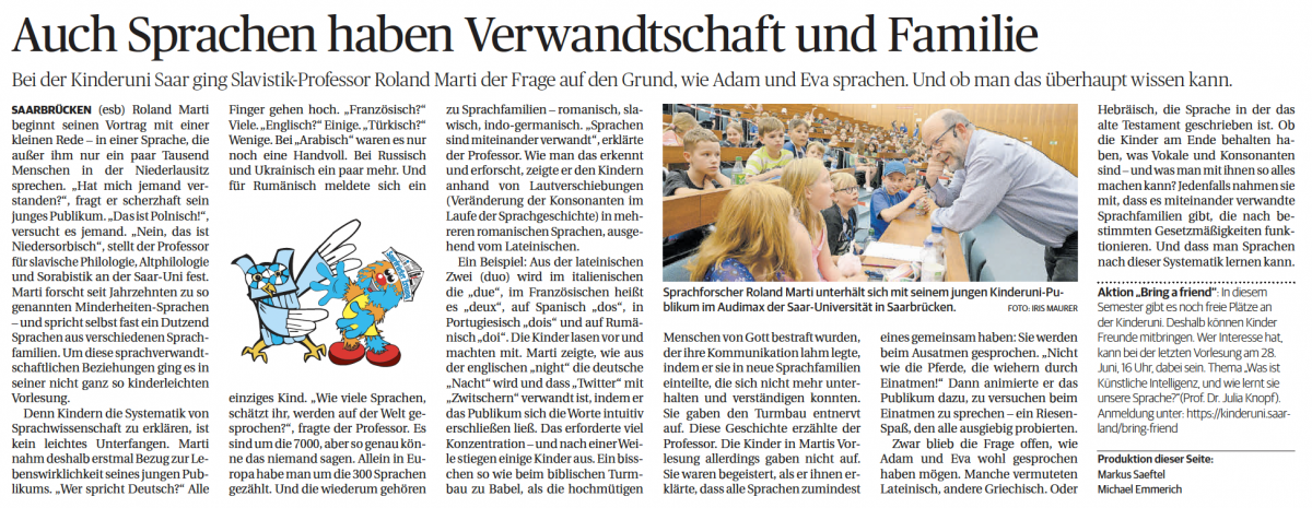 Saarbrücker Zeitung (SZ) vom 5. Mai 2023: Forscher erklärt bei der Kinderuni, wie Sprachen entstehen