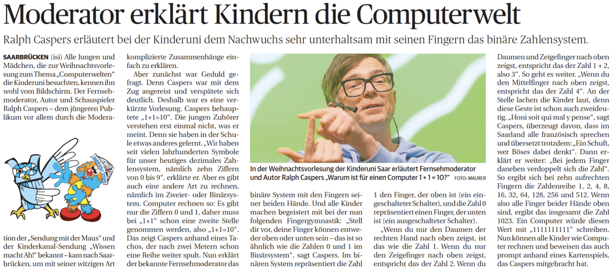 Saarbrücker Zeitung (SZ) vom 15. Dezember 2023: Moderator erklärt Kindern die Computerwelt