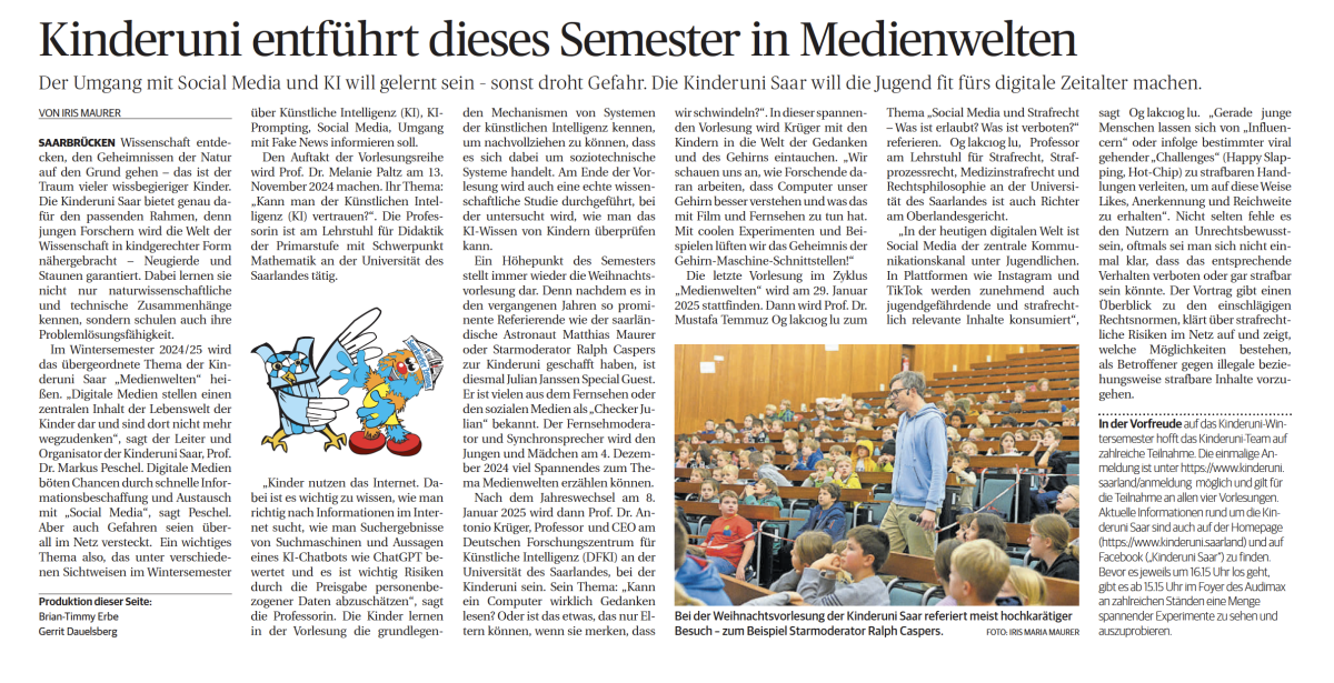 Saarbrücker Zeitung (SZ) vom 6. Dezember 2024: "Checker Julian" begeistert bei der Kinderuni