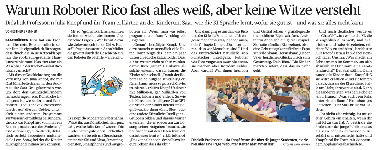 Zeitungsbericht der Saarbrücker Zeitung vom 01.07.2023: Warum Roboter Rico alles weiß, aber keine Witze versteht.