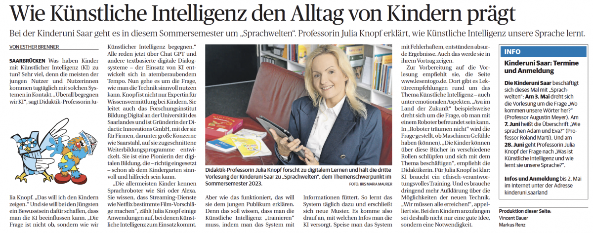 Zeitungsbericht der Saarbrücker Zeitung vom 18.04.2023: Wie Künstliche Intelligenz den Alltag der Kinder prägt.